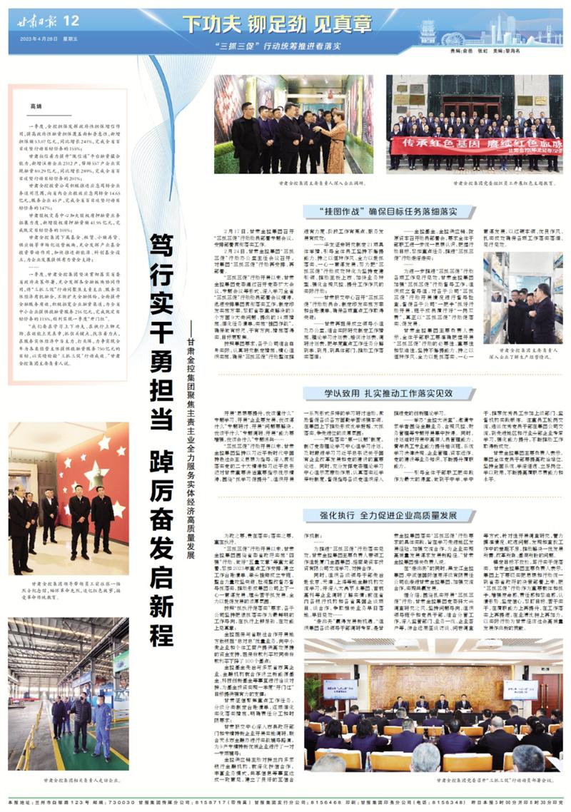 “三抓三促”行動(dòng)開(kāi)展以來(lái),甘肅金控集團(tuán)圍繞省委省政府實(shí)施“四強(qiáng)”行動(dòng)、做好“五量文章”等重大部署,緊扣2023年重點(diǎn)工作安排,建立工作臺(tái)賬清單、牽頭掛帥成立專(zhuān)班、整合力量攻堅(jiān)突破、檢視整改督辦督導(dǎo)抓落實(shí),推動(dòng)形成集團(tuán)公司上下一心一意謀發(fā)展、埋頭苦干抓發(fā)展、全力以赴促發(fā)展的濃厚氛圍。