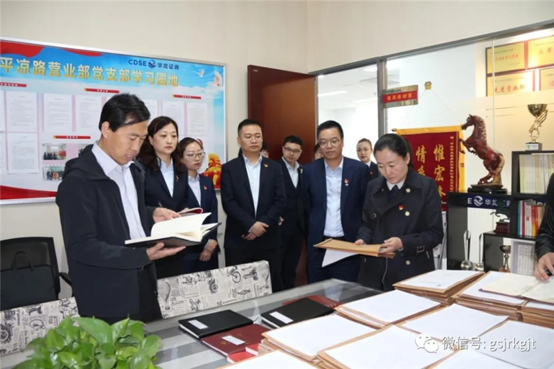 考核組還對金控集團華龍證券2020年度黨建工作責任制落實情況進行了民主測評、個別談話,查閱了黨建基礎(chǔ)資料,并對金控集團辦公室、金控擔保集團、華龍證券蘭州平?jīng)雎窢I業(yè)部等基層黨組織黨建工作情況進行了現(xiàn)場檢查。