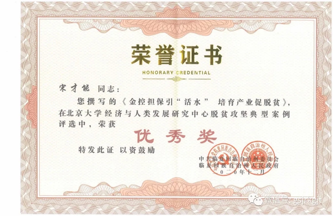 近期,臨夏州脫貧攻堅典型案例評選活動落下帷幕,金控臨夏擔(dān)保推薦的《金控擔(dān)保引活水,培育產(chǎn)業(yè)促脫貧》典型案例經(jīng)北京大學(xué)課題組與臨夏州委宣傳部、州扶貧辦、州文聯(lián)、民族日報社多輪篩選評審,在北京大學(xué)經(jīng)濟與人類社會發(fā)展研究中心脫貧攻堅典型案例評選中榮獲優(yōu)秀獎,得到州委州政府表彰。