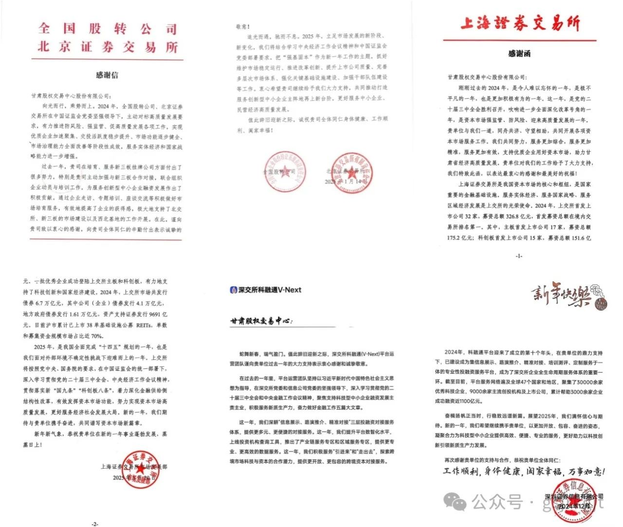 近日,甘肅股權(quán)交易中心收到北京證券交易所和全國(guó)股轉(zhuǎn)公司、上海證券交易所、深圳證券信息有限公司感謝信,對(duì)甘肅股權(quán)交易中心過(guò)去一年給予的支持表示感謝,同時(shí)希望未來(lái)進(jìn)一步加強(qiáng)合作交流,凝聚合力服務(wù)實(shí)體經(jīng)濟(jì)高質(zhì)量發(fā)展。
