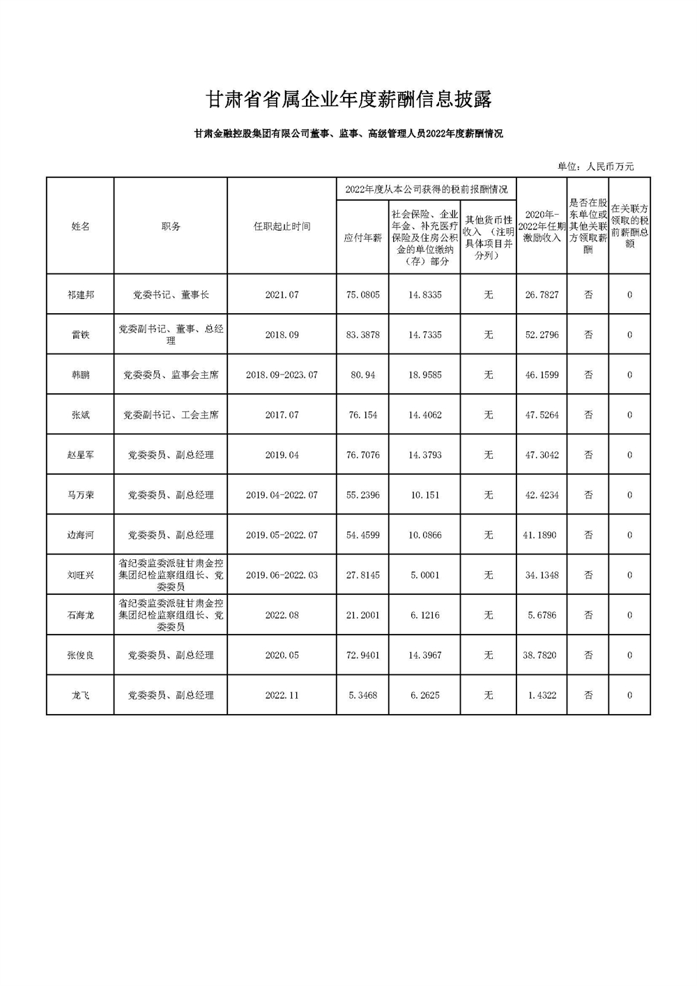 甘肅金融控股集團(tuán)有限公司董事、監(jiān)事、高級(jí)管理人員2022年度薪酬情況披露